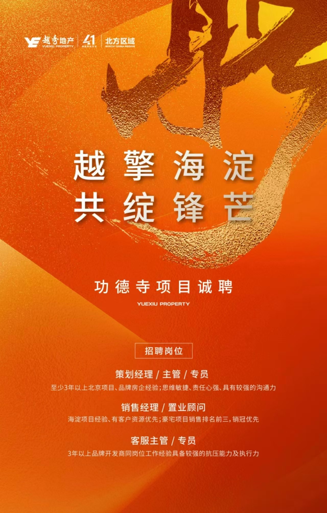 具体看,这张海报的主要内容是由越秀地产北方区域,为功德寺项目招聘策划经理、主管、专员;销售经理、置业顾问;客服主管、专员。