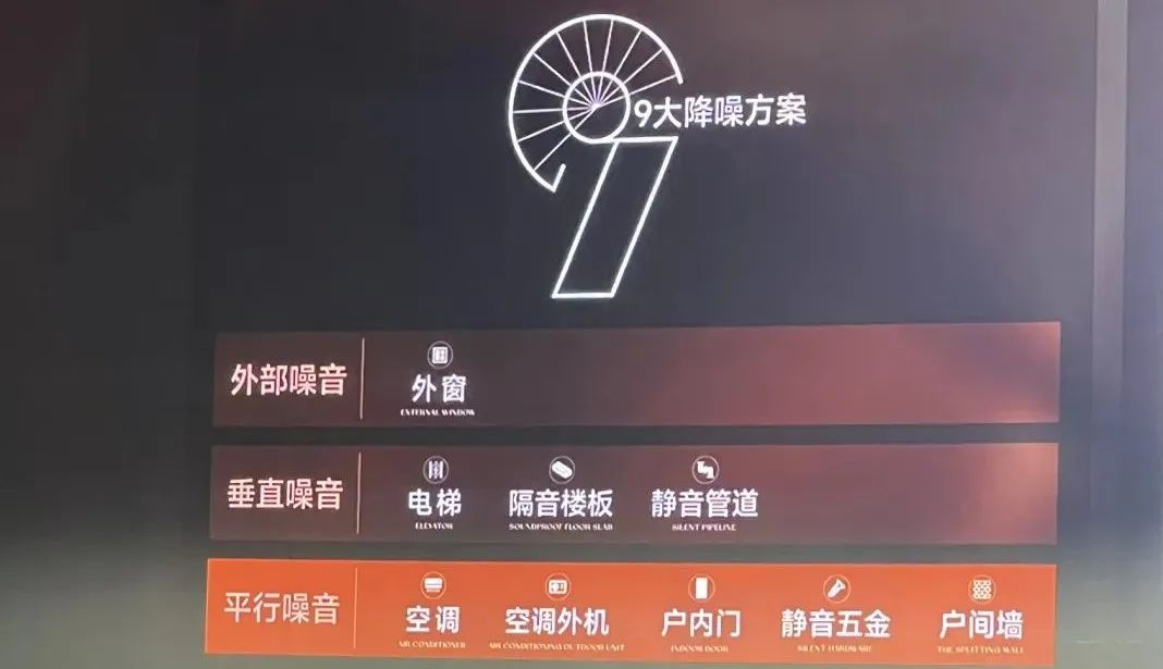 关于外窗、电梯、隔音楼板、静音管道、空调、空调外机、户内门、静音五金、户间墙。其中外窗降噪是重点。