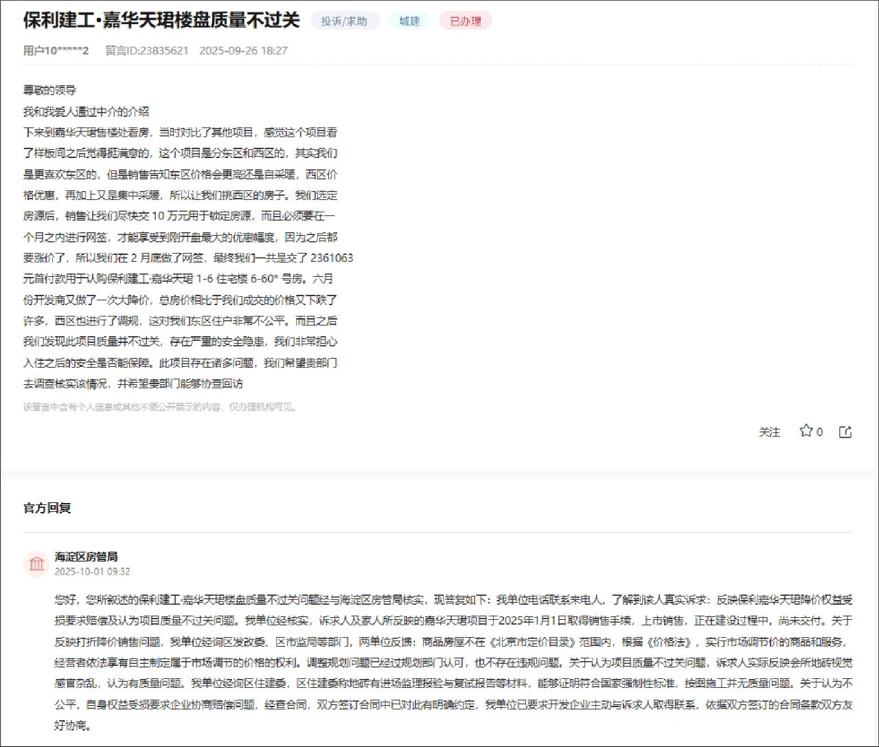 10月1日,海淀区房管局在人民网予以回复:"调整规划问题已经过规划部门认可,也不存在违规问题。"