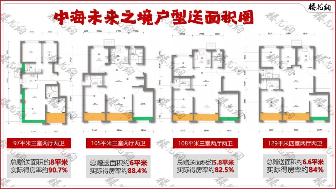 中海未来之境4款户型中,97平米平米的阳台进深为1.5米,其余105/108/129平,则为1.2米。其整体的实际得房率,在85%左右,超出板块内其他项目5%-10%。