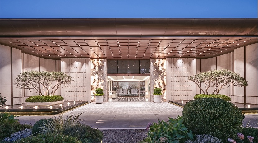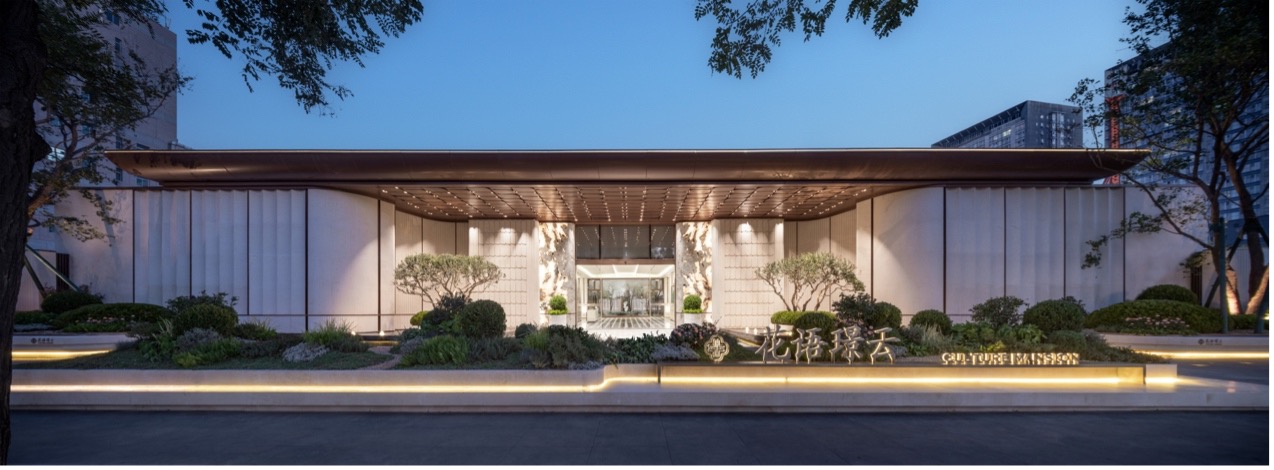 花语璟云大门净高约5.8米,总高约6.7米,总宽约55米,西街横向沿街面展示约100米,宏大瑰丽。项目从“润玉梨花”中汲取灵感,将自然诗意淬炼于门仪形制;眼前所见是其华美的主体,未来两侧延伸,将形成超百米宽的震撼门仪,寓意着每一位家人前程似锦,整个社区欣欣向荣。