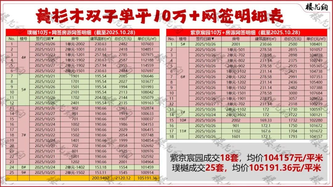 紫京宸园拿证559套,网签率13.24%,签约面积12341.04平米,均价98449.53元/平米;璞樾拿证308套,网签率24%,签约面积12630平米,均价10030.07元/平米。
