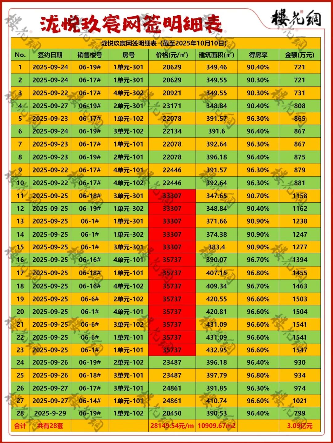 它还有一个待解之谜,泷悦玖宸最初网签28套房源里,在2025年9月25日突然网签了13套,且上叠价格统一为33307元/平米,下叠统一为35737元/平米。