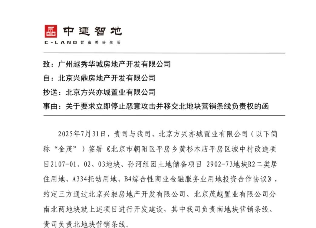 事由是,关于要求立即停止恶意攻击,并移交北地块营销条线负责权的函,抄送北京方兴亦城置业有限公司——中国金茂旗下公司。
