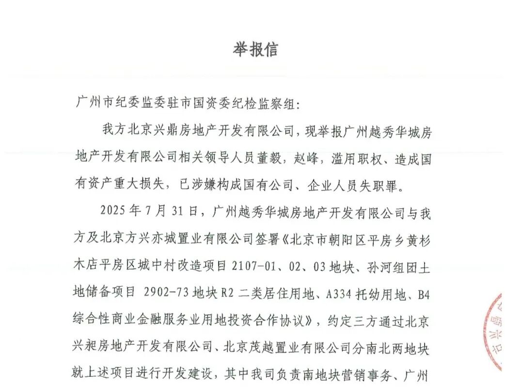 在2025年11月10日,流出一封兴鼎地产,向越秀地产旗下广州越秀华城房地产发出的函件。