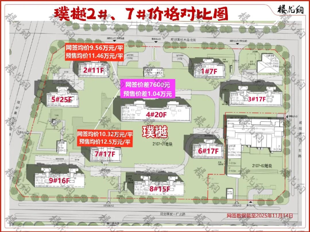 花姐查询,2#的预售参考均价为11.46万元/平米,网签价为9.55万元/平米;7#的预售参考均价为12.5万元/平米,网签价为10.32万元/平米。