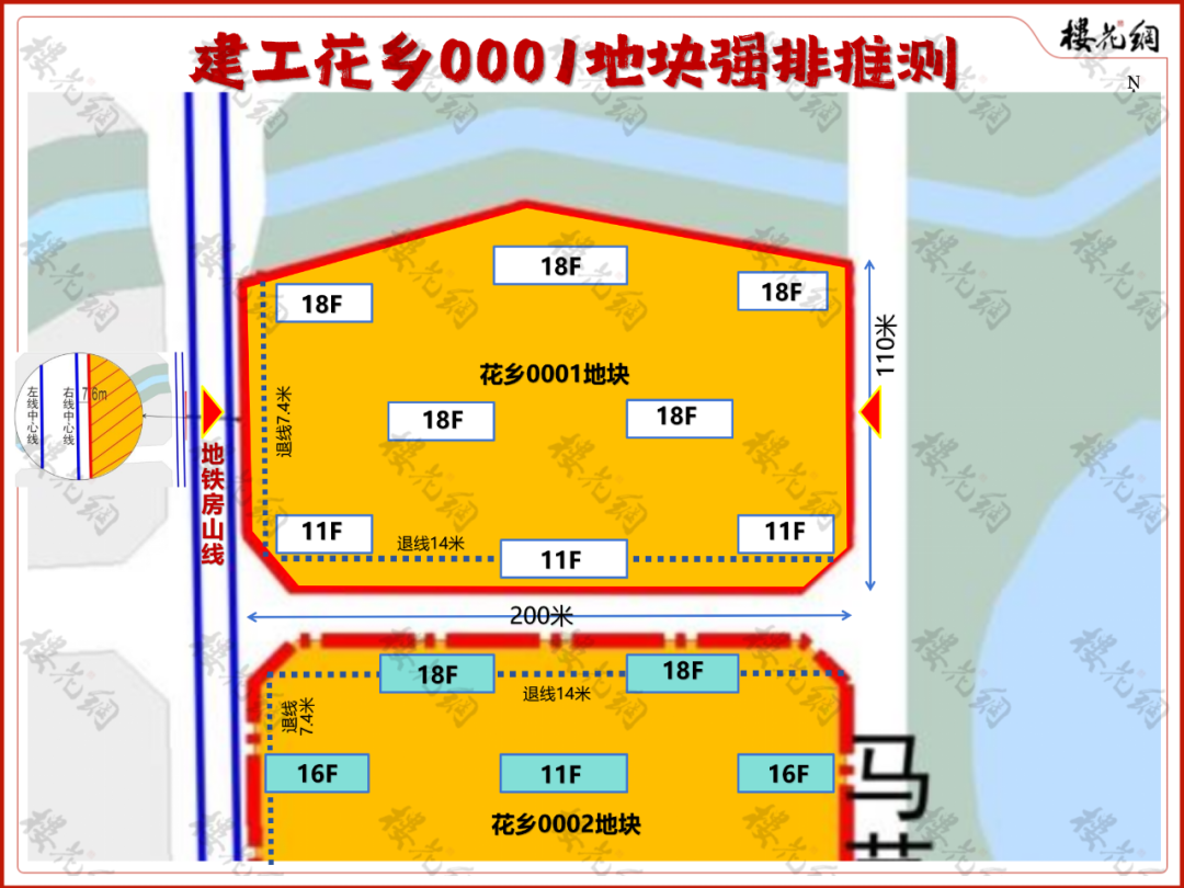 1、西门紧挨地铁房山线,外轨中心线距离地块西红线为7.6米。按照地铁退线规则,0001地块的建筑须再退线7.4米。