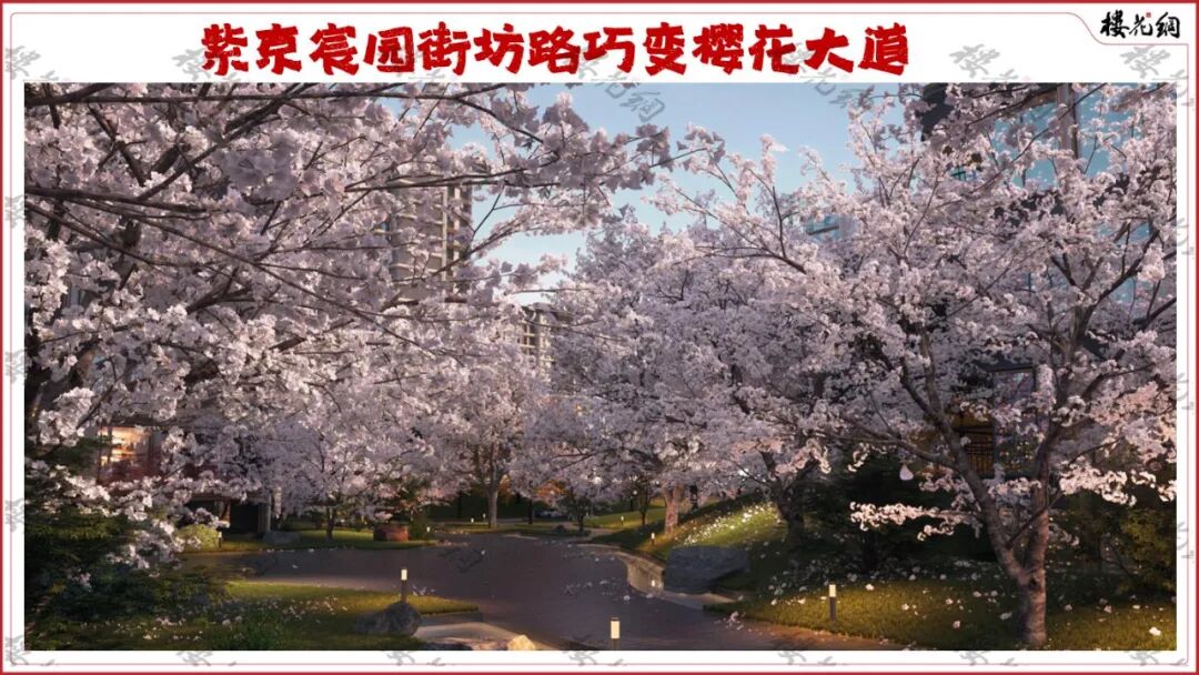 此外,在紫京宸园内部有一条街坊路,位于小区的东侧,在实际的规划中,这条街坊路被打造成了樱花林,自北向南蜿蜒而下。