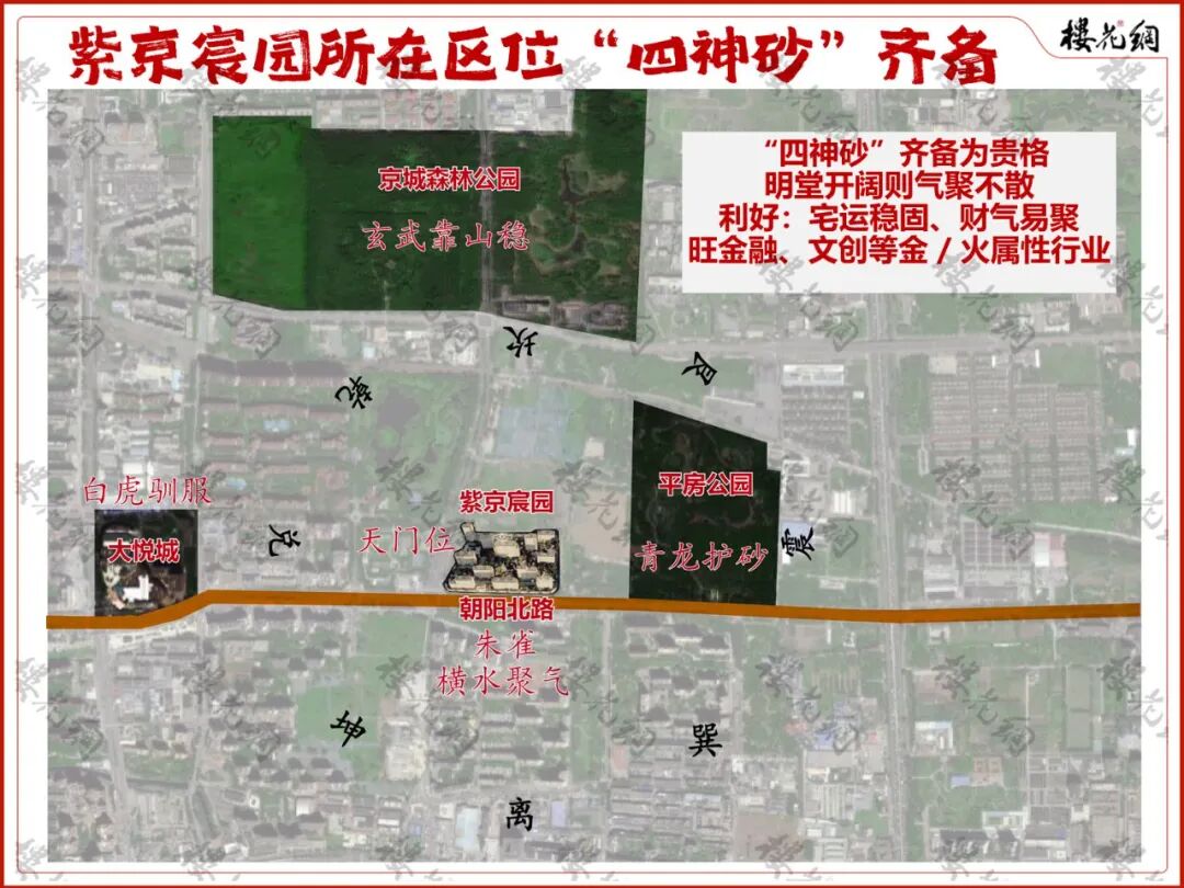 它的北边为京城森林公园,即“玄武靠山稳”;南边为朝阳北路,路为水,“横水聚气”;东边有平房公园,为“青龙护砂”;西近商圈,则为“白虎驯服”。