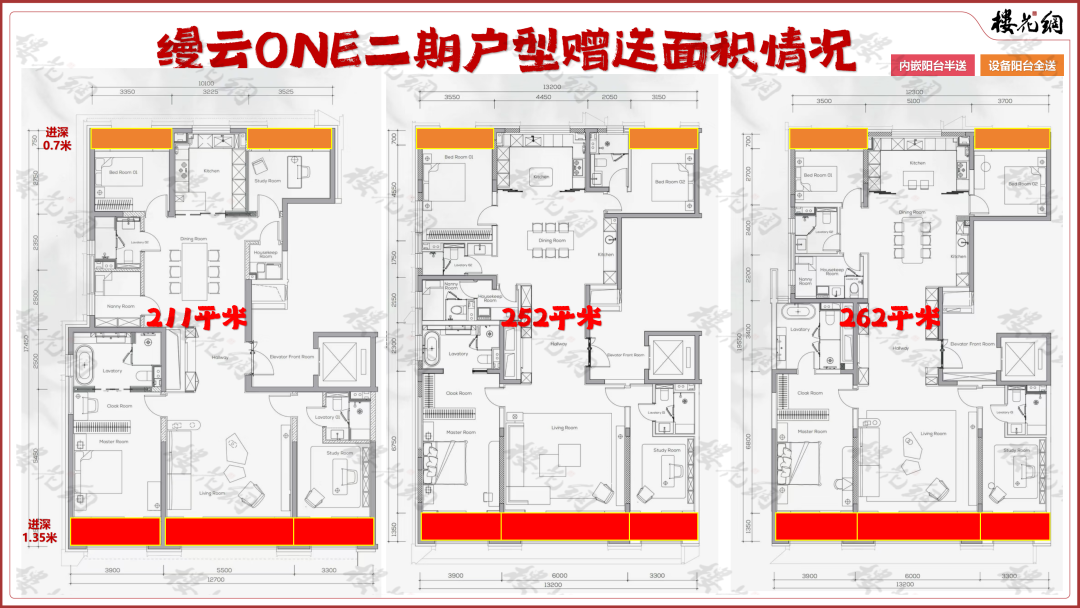主要是每套房的南面通面,设置了内嵌式阳台,进深1.35米,北面赠送两个设备阳台,进深0.7米。
