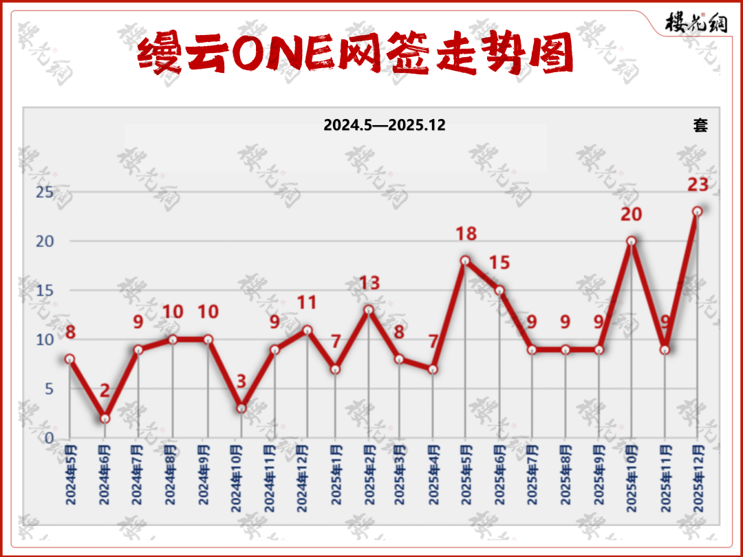 花姐按月对它做了一个网签走势表,发现整体网签是一路向上的,在2025年12月拿到了网签最高点——23套。