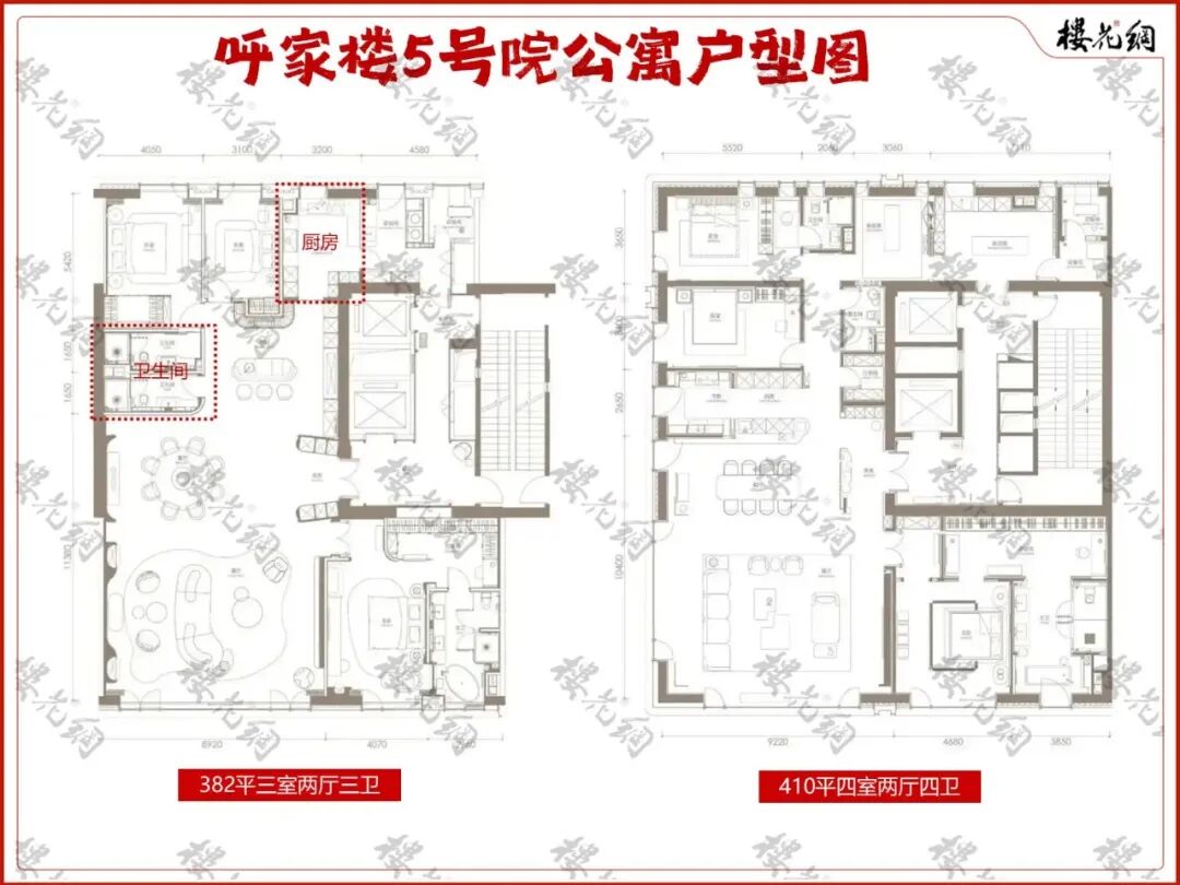 二者南向均为超级面宽的客厅和主卧套;主要差别在北向,从居住舒适性上看,410平要远远强于382平。