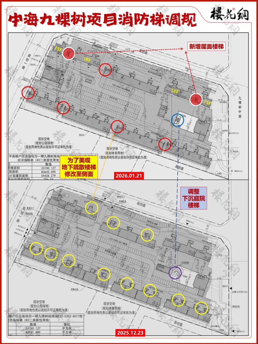 新旧两版图纸,还有有个很隐蔽的变化:疏散楼梯有了大改动。不仔细看,很难发现这点。
