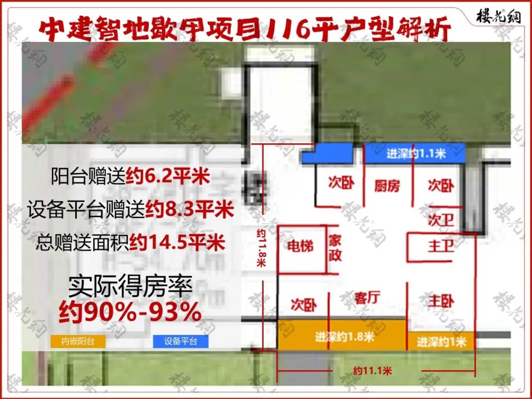 整体的阳台面积约12.4平米,赠送一半;设备平台面积约8.3平米,全部赠送。
