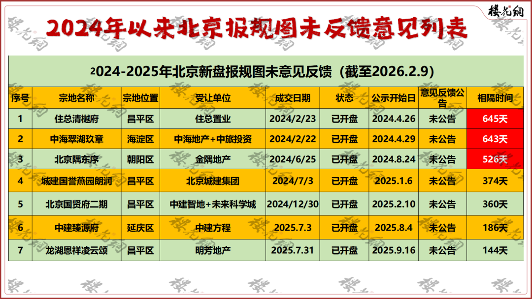 按距离公示报规图的天数排序:住总清樾府(645天)、中海翠湖玖章(643天)、北京隅东序(526天)、城建国誉燕园朗润(已领预售证、374天)、北京国贤府二期(360天)、中建臻源府(186天)、龙湖恩祥凌云颂(144天)。