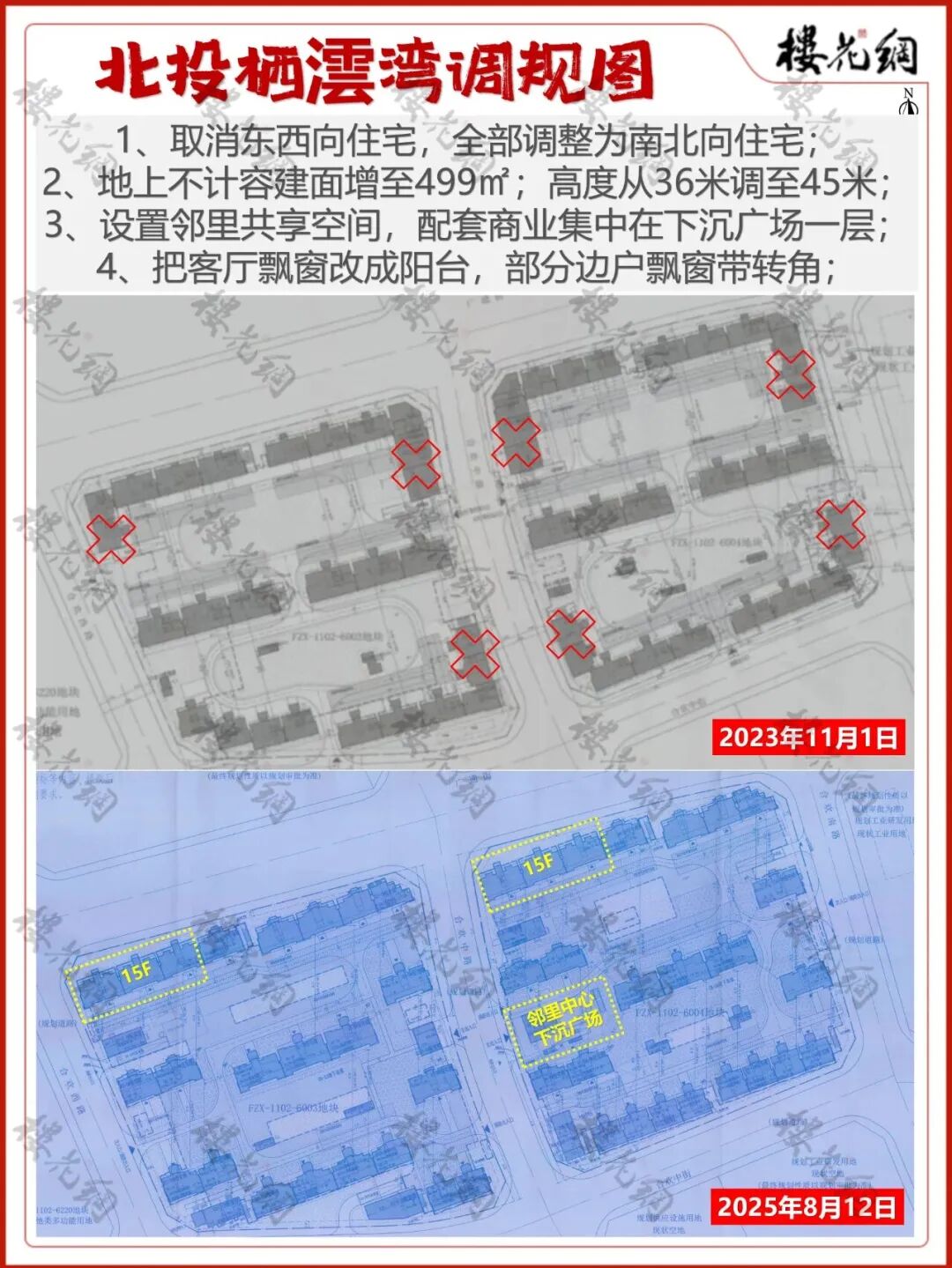 主要变化为:1、点状式布局,全部住宅楼调成南北向;2、增加好房子元素,包括公区配置和内嵌阳台,等等。(详见《这家国资地产商,太能折腾了》)
