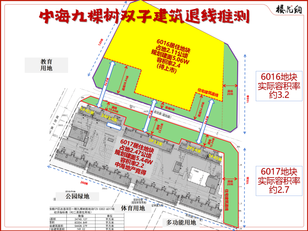 如果它们都加上东面绿化退线20米,6017地块和6016地块的实际容积率,分别为2.7和3.3——土地文件为2.2和2.4。