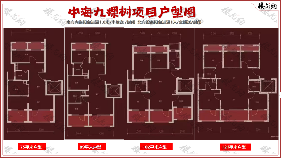 共计四款户型:75平米三居、89平米三居、102平米三居和121平米四居。