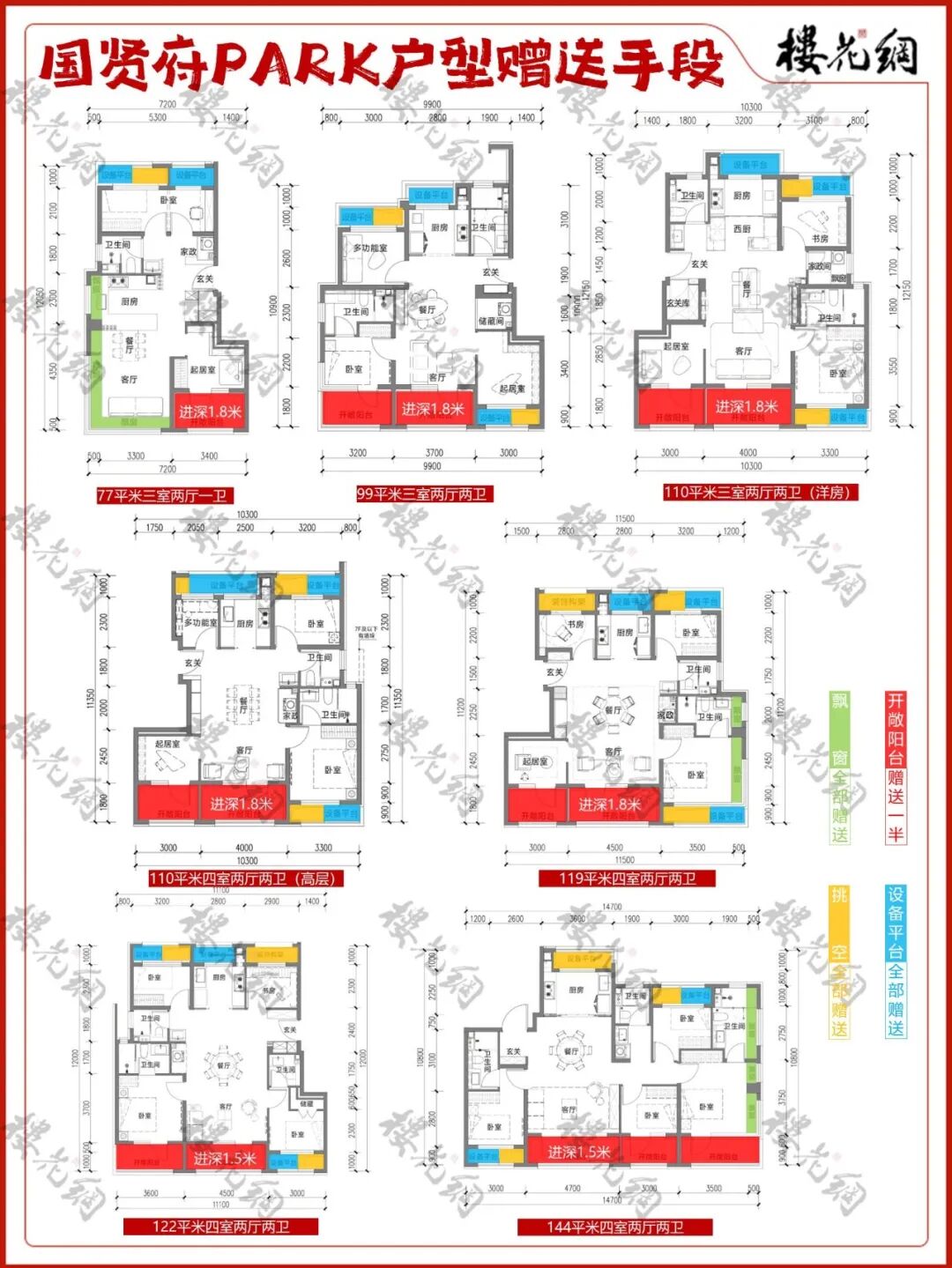 它共有七款户型,从77平米至144平四居,共6个面积段。
