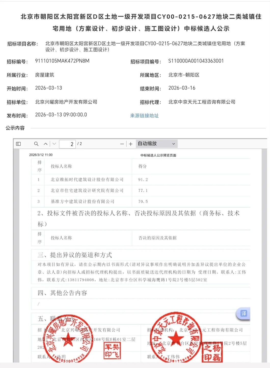 北京维拓时代以91.2分的得分,击败了北京住宅建筑设计院和基准方中——77.1分和70.5分,中标金额为1071.918万元,周期为120天。