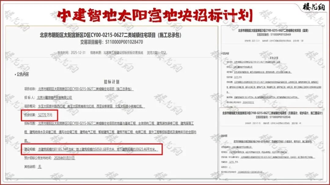 花姐找到了四条信息,有3条为招标计划,在2025年12月31日和2026年1月5日发出;有1条设计招标公告,在2026年2月12日发出。(详见《太阳宫地王,中建智地有了新消息》)