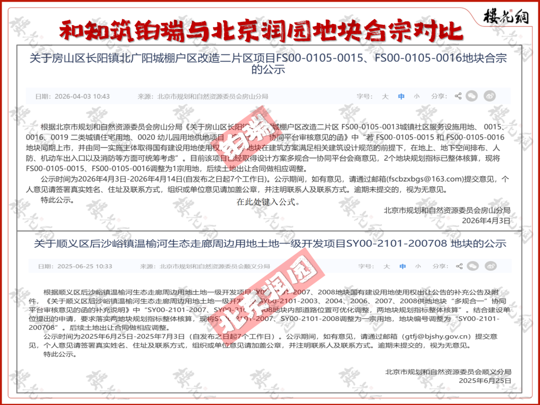 北京润园地块的公示标题里,直接写上了合并后的编码“200708”,内文也明确地块编号调整;铂瑞的公示标题,两块地编码依然是分开的,内文也没提及编号调整问题。