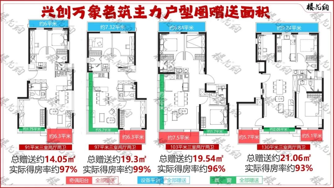 其次为91平,总赠送面积约14平米,实际得房率约97%。