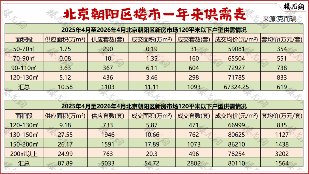 来看克而瑞对2025年4月至2026年4月,朝阳区住宅市场的数据: