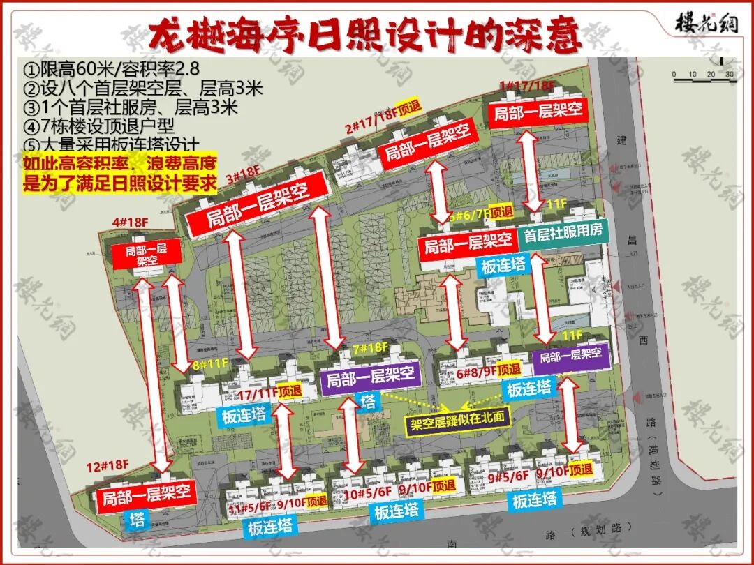 A、西南角12#设架空层,大概是因为离北面红线太近;B、6#东边两单元、7#的架空层,很有可能设在北面。(详细原因,加花姐微信louhuar007)