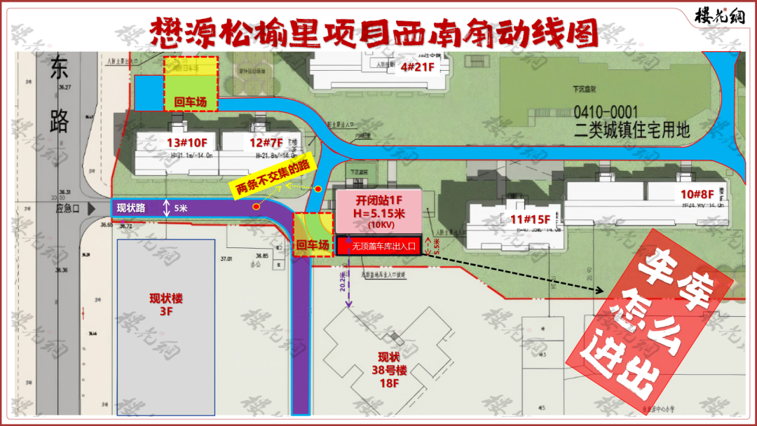 从图纸上看,懋源在38号楼北面14.7米处,设计了一个屋顶盖地库出入口;再往北紧挨的是一座开闭站,约300平米,1层、高5.15米。