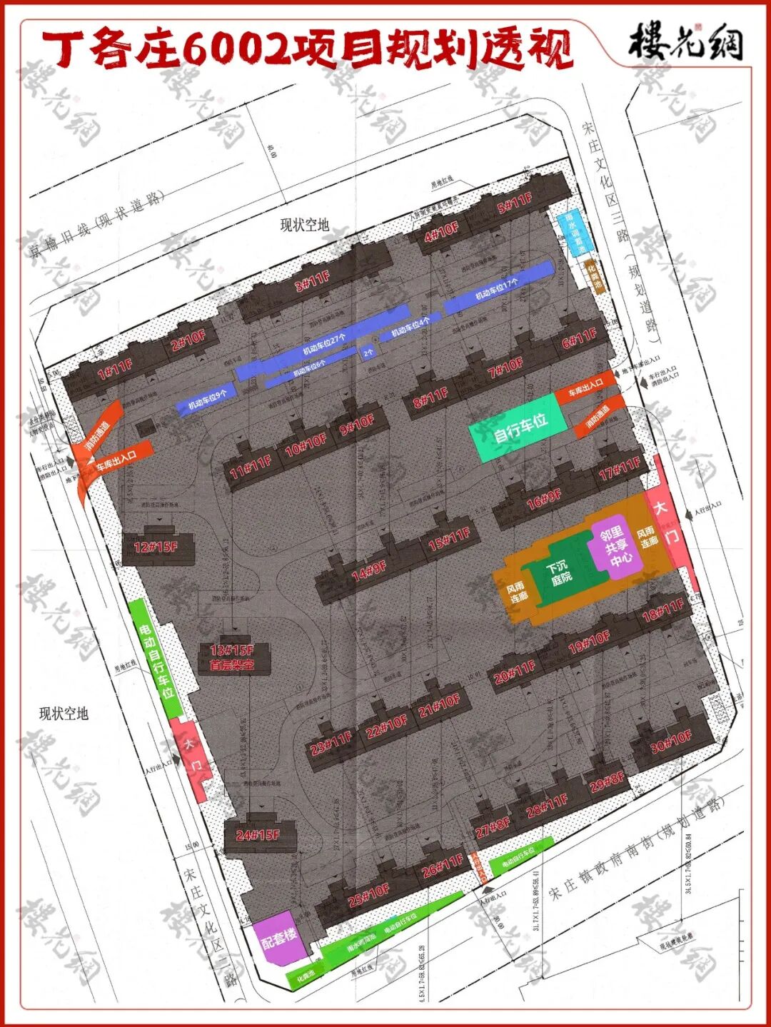 1、首开6032地块:占地3.88公顷,地上建面8.93万㎡,容积率2.3,限高60米;西南角有幼儿园,有噪音。