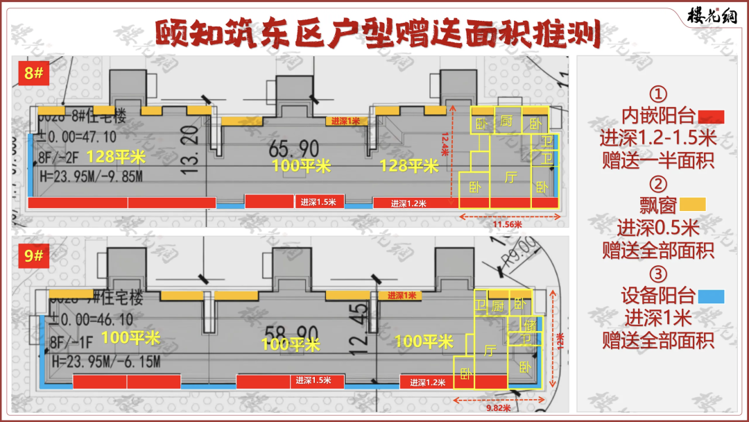 根据报规图,花姐推测其南向阳台进深有三种:1.4米、1.5米和1.8米,封闭、计入一半面积;南向没有阳台的地方,有飘窗赠送;北面设备阳台进深1.1米,不计入面积。